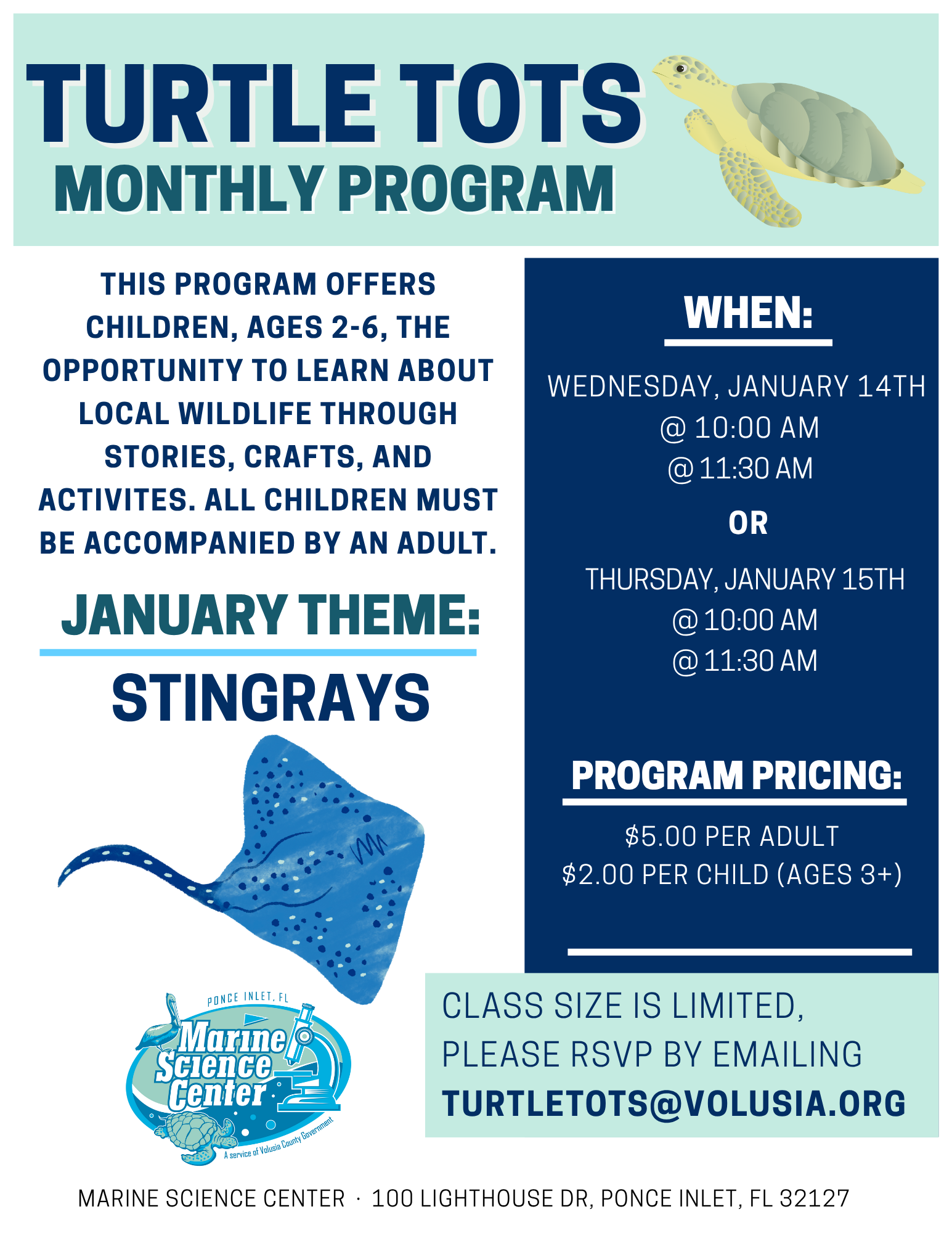 Class size is limited, please RSVP by emailing turtletots@volusia.org.