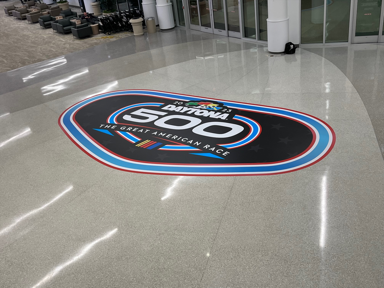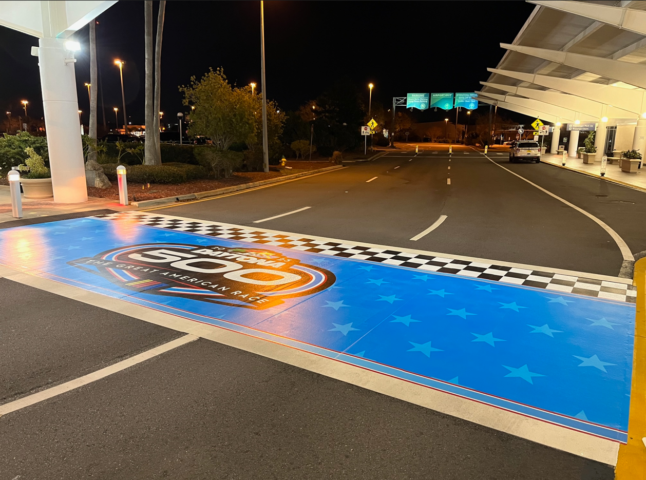 The DAYTONA 500 is days away, and the racing experience has already taken off at Daytona Beach International Airport (DAB). Race car fans and other airport visitors flying into Daytona Beach will have plenty of selfie opportunities including a Daytona International Speedway pace car on the airport’s first floor lobby, a large Daytona 500 floor decal, tire art on the bag belt and a checkered flag themed crosswalk.