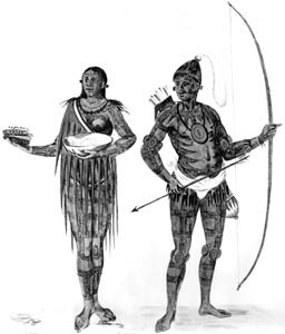 Thanks to various French and Spanish observers, we have views of how Timucuan people actually looked. They were tall, handsome, and athletic. The men wore their hair pulled up in top knots. Women wore Spanish moss skirts and jewelry made of shell and bone. Both men and women sported striking tattoos of red, blue, and black.