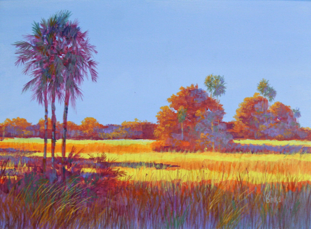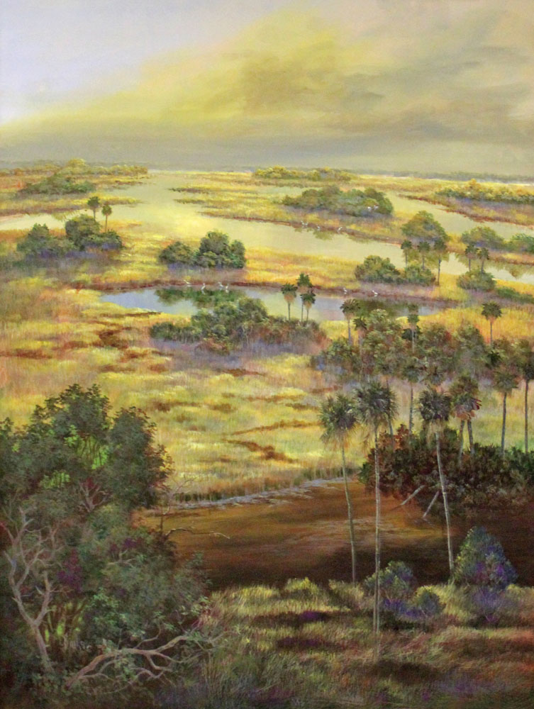 “’St. Johns Prairie” was inspired by numerous trips over the bridge on State Road 415 near Sanford. The view truly represents Old Florida before civilization encroached upon the area. It is possible on any day to observe alligators, sandhill cranes, eagles and osprey going about the business of life as it always has been. It is hoped the picture conveys to the viewer the majesty without clutter, intended to be pure and untouched.” – Robert Binks