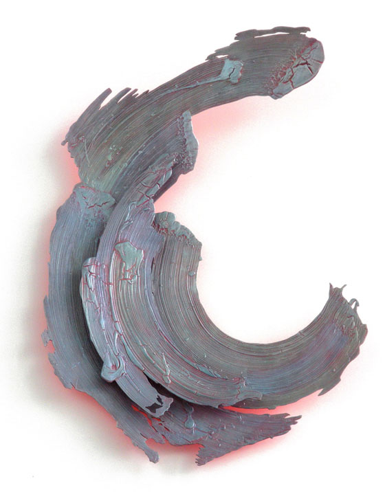 “In ‘East/West,’ I used iridescent oil paint on thickened gesso over wood. The heavy brush strokes are to create a sense of spiral motion, and the fluorescent glow from the shadows evokes a sense of energy emanating from the rustic wood sculpture. The overall effect is intended to be a harmonious balance of light, movement and nature capturing the Ocean Center's theme of sun, sand, surf and speed.” – Jack Casey