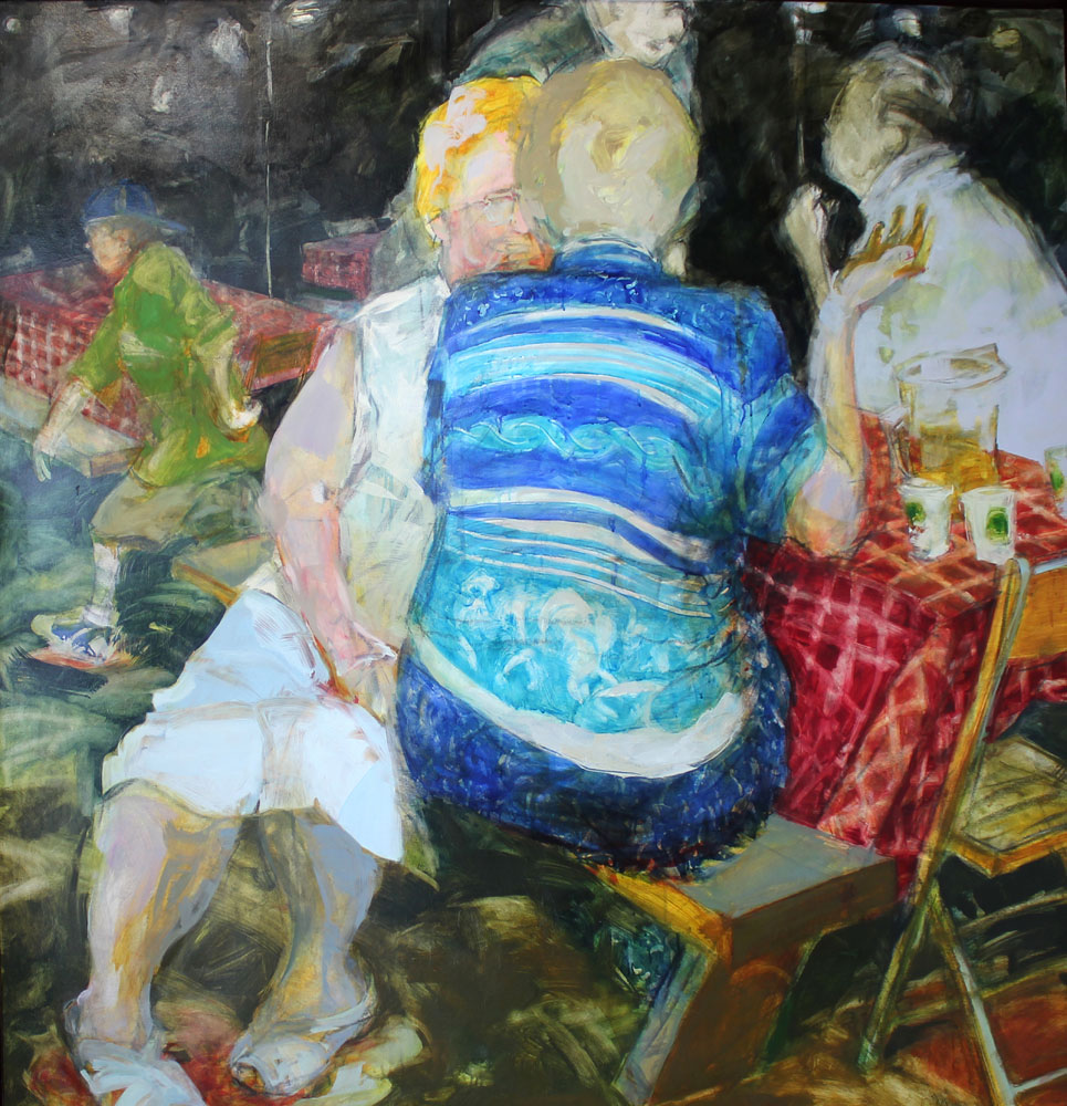 “This painting explores the dynamics of a generation where men and women tend not to intermingle. Their interaction is stifled; women gravitate toward the women, the men toward the men. One of my aims is to involve the viewer, sparking recognition and familiarity. Viewers easily can associate the garb and gesture of the figures with their own memories or experiences. My personal association with this painting takes me to the ethnic community of Parma, Ohio, a place where traditionally the men folk sit in the front seat of the Chevy as the women gab in the back.” – Rose Thome Casterline