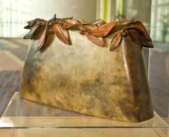 "Growing up on a lake in the Mississippi delta, I spent a lot of time alone, surrounded by natural beauty. My pots are simply reflections of my love of nature in its purity of form and surface. Technically, my work is hand-constructed or cast and altered of terra cotta, then burnished with terra sigillata, a fine clay slip. The work then is usually pit-fired outside in hay, sawdust, bamboo and other plants. Hopefully, the pieces I made for the Ocean Center reflect my love for the natural beauty of Volusia County. I am so delighted and honored to have my work chosen for this magnificent new building.” – Sang Parkinson Roberson