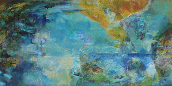 “I walk along the springs run toward the headspring. The water cuts a wide swath through the grasses bending sideways in the current. Gar hover in formation, pointing into the flow. A mantilla of water beetles circles in a tangle of frenzied activity. As I look down into the water, a turtle careens away in a wild gymnastic display. Hundreds of fish stud the depths, hovering over small sand boils bubbling in the river bed. I am drawn to a small cypress on the distant bank. All the water seems to flow from just under this tree, from a thousand orifices in the bank, from the pores of the aquifer.” – Margaret Ross Tolbert on her painting, "Springs Run"