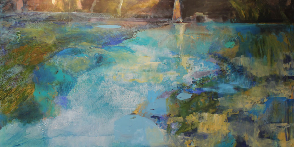 “All is changed in this world under the surface. Space seems to have blown apart. Here, underwater, I am flying in a room that expands in all directions. Everything is tinged with violet, the leading edge of a prismatic light that wafts in a plume to the surface. Fish hover, curious, then dart away, their shadows coursing across the white sand. The blurry line of trees above the surface seem infinitely far away from this world inside the spring.” – Margaret Ross Tolbert on her painting, "Behind Blue Springs"