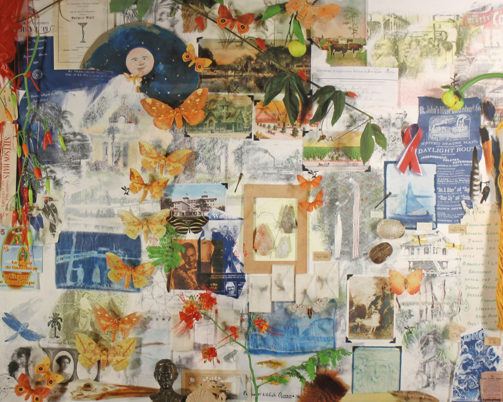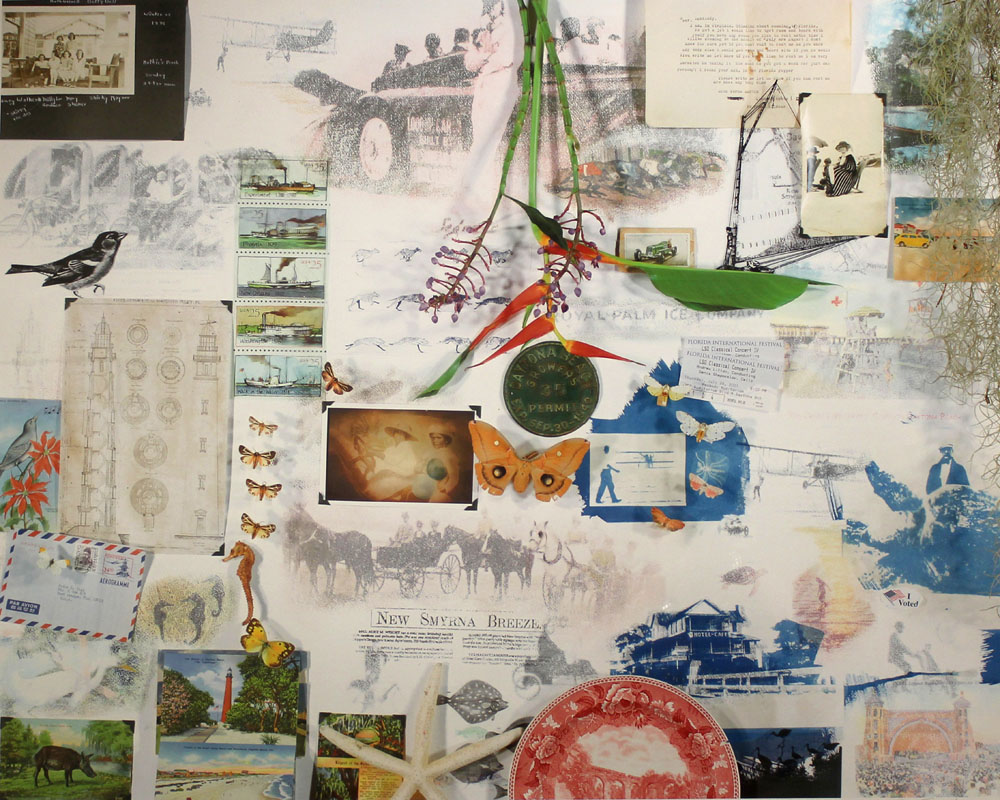 “The layers of imagery are derived from various processes, which include color and black and white Xerox photo copies transferred with a thinner onto water color paper, collaged with blue and brown print, Polaroid transfers, drawings, original photographs and vintage postcards. The final collage/assemblage with three-dimensional objects and artifacts then was photographed with a digital back on a 4x5 camera and printed with the Iris print process, a digital drum printer of high resolution. For ideas I looked through the archives of the DeLand House Museum and the West Volusia Historical Society, Stetson University, the Halifax Historical Society and many more for months.” – Anna Tomczak