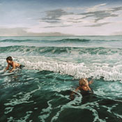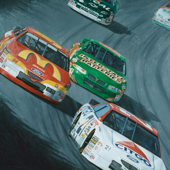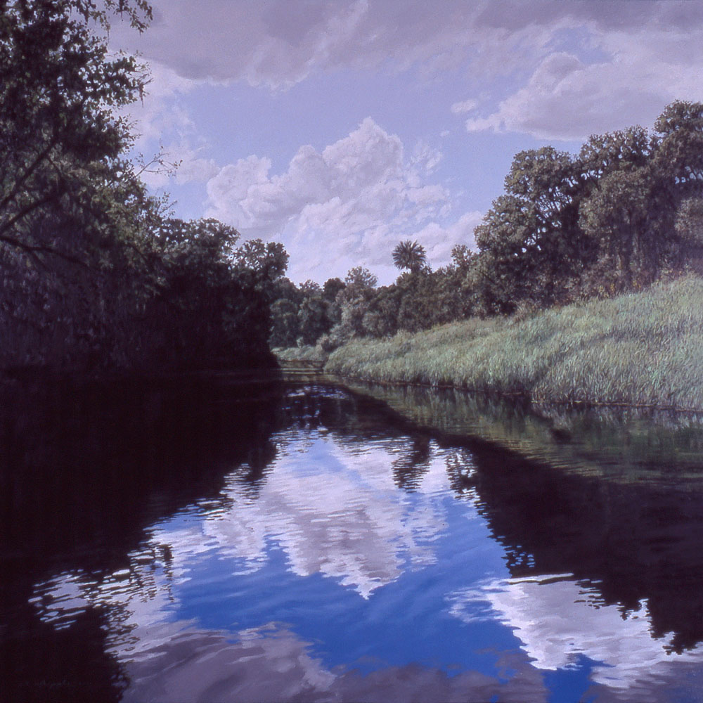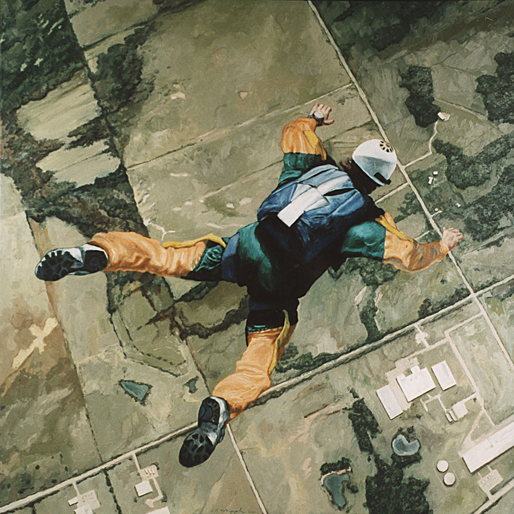 “It would take hundreds of paintings to effectively depict the variety of lifestyles and environments of Volusia County. The four images I used were chosen somewhat randomly and aren’t meant to represent the whole county but they coincidentally represent some of the wide range of elements and contrasts in the region. In one image, the tumultuous Atlantic contrasts the gently flowing river. In another, the frenetic car race contrasts the floating skydiver. The crashes of the waves and the screaming car engines contrast the silence of a parachutist and the serene nature sounds of the secluded rivers.” – Jeff Whipple