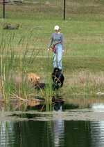 Barkley Square Dog Park encompasses more than 14 acres and provides areas for large dogs, small dogs, training events, and time-out spaces. The dog park is situated on a parcel of land with many trees and even a small, lined pond in the large dog area.