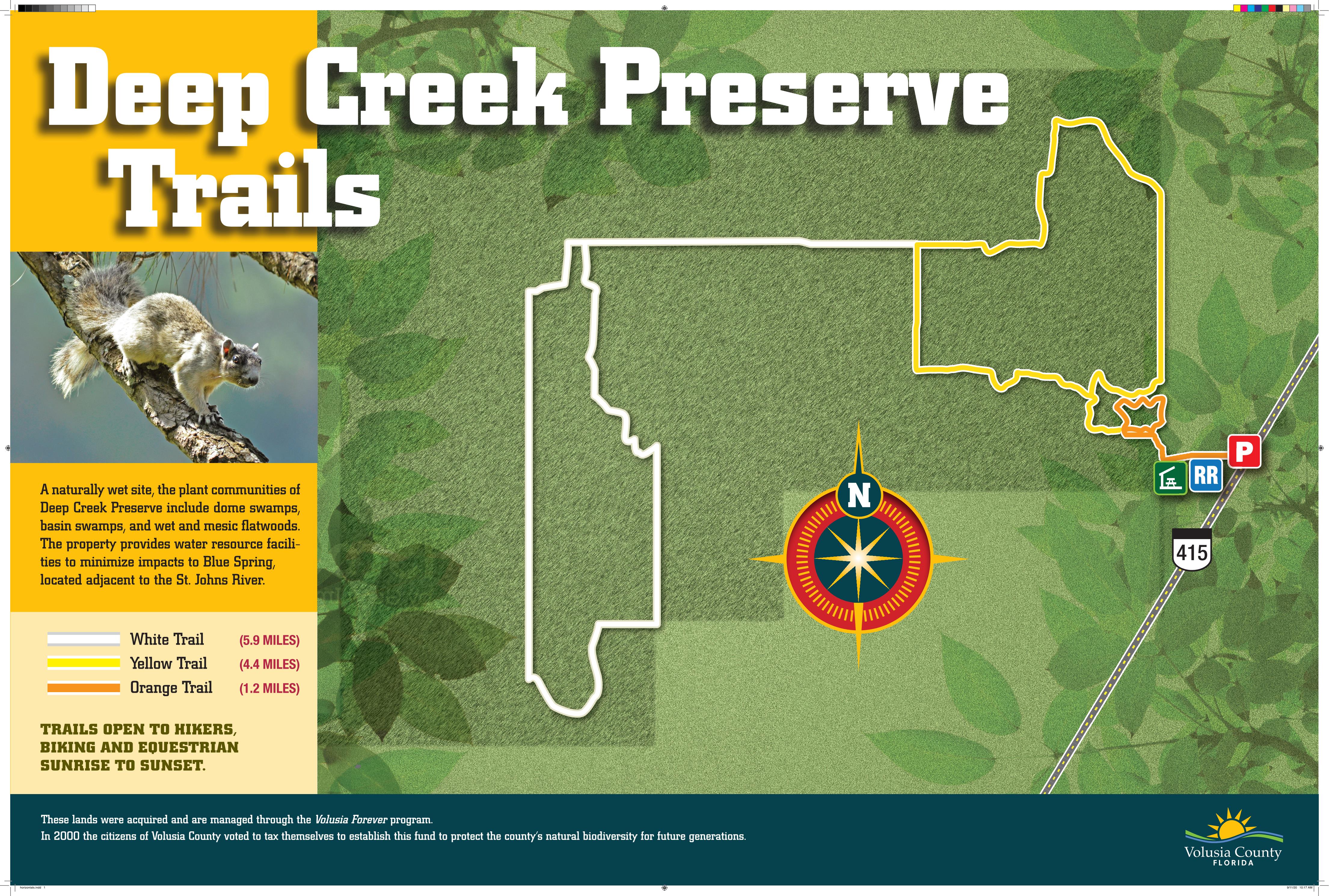 The entrance to Deep Creek Preserve is on the west side of S. State Road 415, 4.5 miles south of State Road 44 and 6.5 miles north of Howland Boulevard.