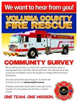 Perhaps equally important, Fire Rescue wants the public’s input to help make sure that the agency and its employees are projecting a courteous and friendly attitude and remain engaged with the community. Fire Rescue services all of unincorporated Volusia County plus three municipalities – Lake Helen, Oak Hill and Pierson.