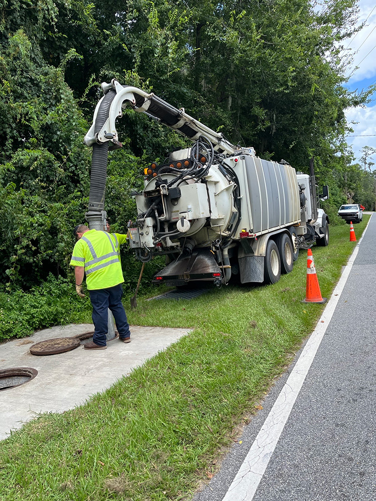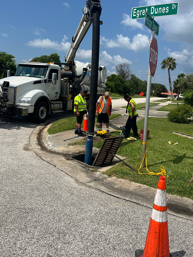 • July 17 - Volusia County's Stormwater Division is currently performing maintenance on the stormwater exfiltration system in the Halifax Plantation subdivision in Ormond Beach. Crews are using a vacuum truck to clean out the system. These systems are designed to collect and treat runoff by allowing water to slowly seep into the ground, which helps reduce flooding, protect nearby waterways, and improve overall drainage. Over time, their performance can decline as sand, sediment, leaves, and other debris accumulate, making routine maintenance essential to ensure proper function.