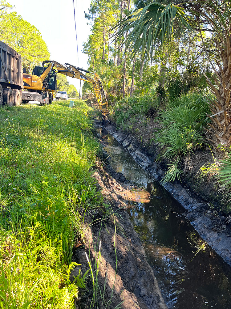 • October 17 - This week, a roadside ditch crew continued drainage maintenance efforts in the Village of Pine Run neighborhood near Ormond Beach. The team is clearing roadside ditches and restoring swales to improve water flow and system performance. Work is scheduled for completion by early next week, after which the improvements will enhance drainage capacity, reduce localized flooding, and strengthen overall stormwater management in the area.