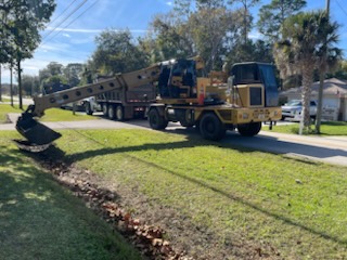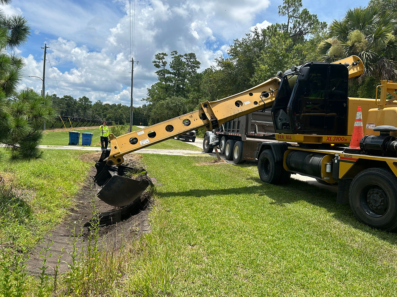 • June 16 - Stormwater drainage crews worked in the Oliver Estates subdivision near New Smyrna Beach to perform ditch maintenance. Using a Gradall excavator, they removed debris and sediment to improve water flow and reduce the risk of localized flooding during heavy rain. The excavated material was loaded into dump trucks and transported offsite for proper disposal. This routine maintenance helps ensure the stormwater system functions efficiently and protects nearby homes and roadways.