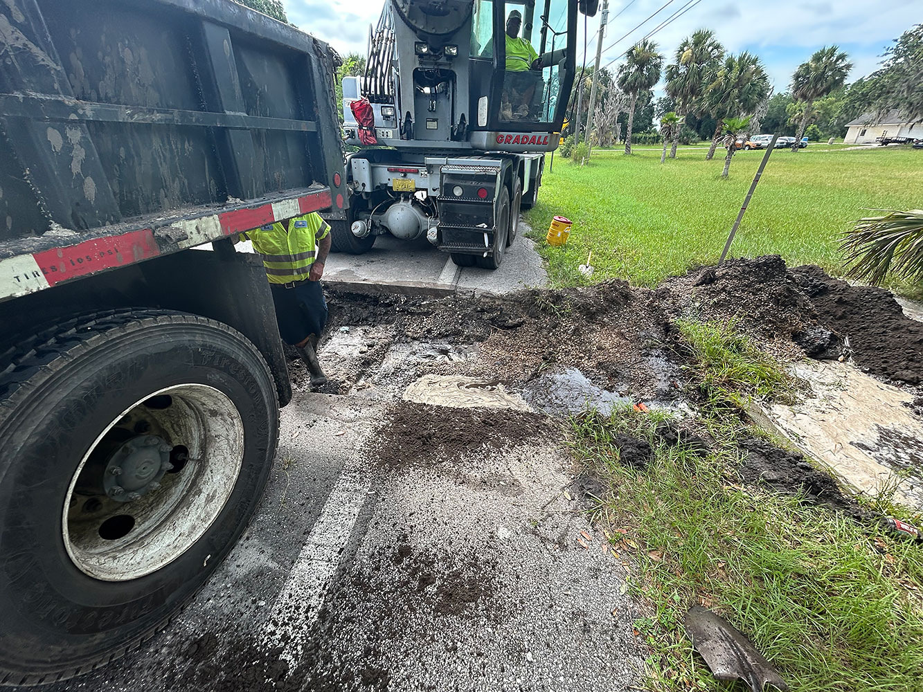 • July 25 - A Road and Bridge Drainage Construction crew recently completed a drainage pipe repair on Pioneer Trail in New Smyrna Beach, between Sugar Mill Road and Turnbull Bay Road. Using a Gradall excavator and vacuum truck, equipment operators and tradesworkers excavated the area, uncovered the damaged pipe, and made swift repairs to minimize disruption to traffic.